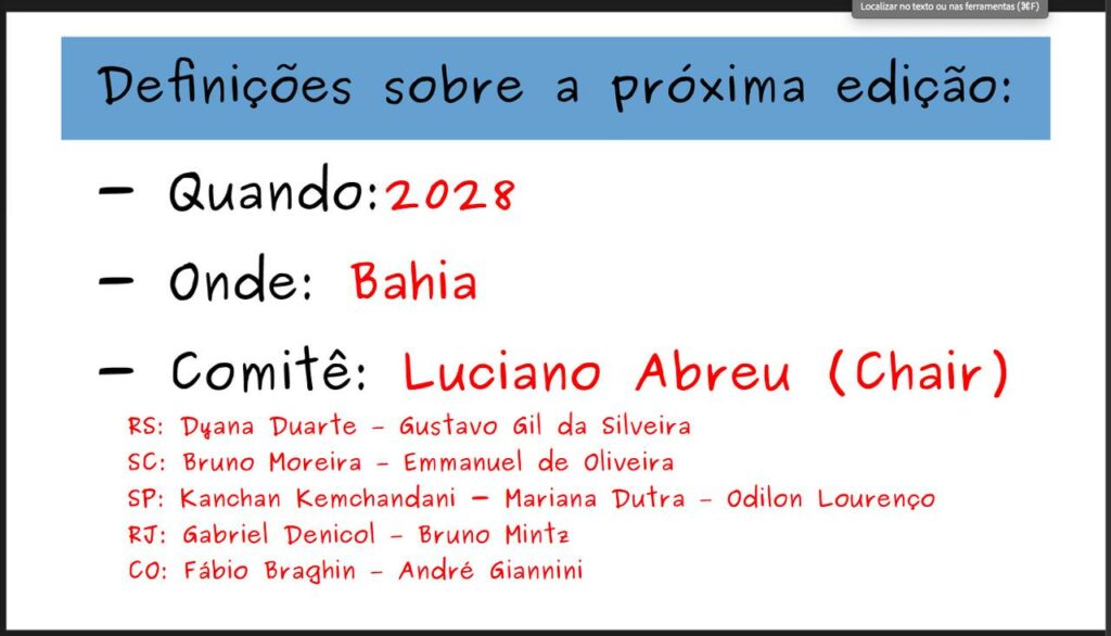 Na Assembleia do XVI International Workshop on Hadron Physics (Hadrons 2025), que ocorreu na cidade de Porto Alegre-RS entre os dias 10 e 14 de março de 2025, foi aprovada a proposta de realização da 18a. Edição do evento em 2028 na Bahia. Teremos portanto a responsabilidade e satisfação de organizar a Hadrons 2028.