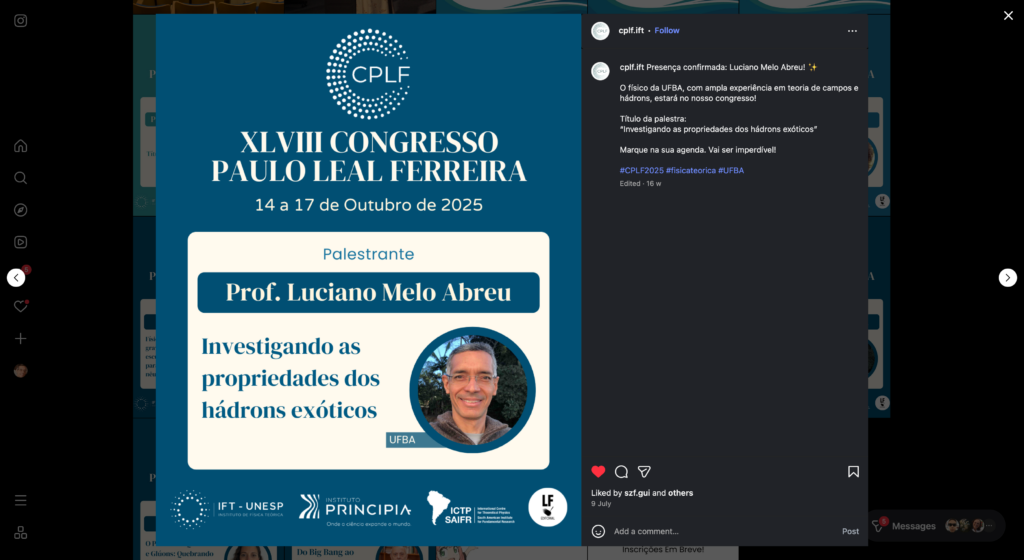 No dia 15/10/25 ministrei o Seminário intitulado “Investigando as propriedades dos hádrons exóticos”, durante o XLVIII CONGRESSO PAULO LEAL FERREIRA, ocorrido no Instituto de Física Teórica da UNESP, São Paulo, SP.